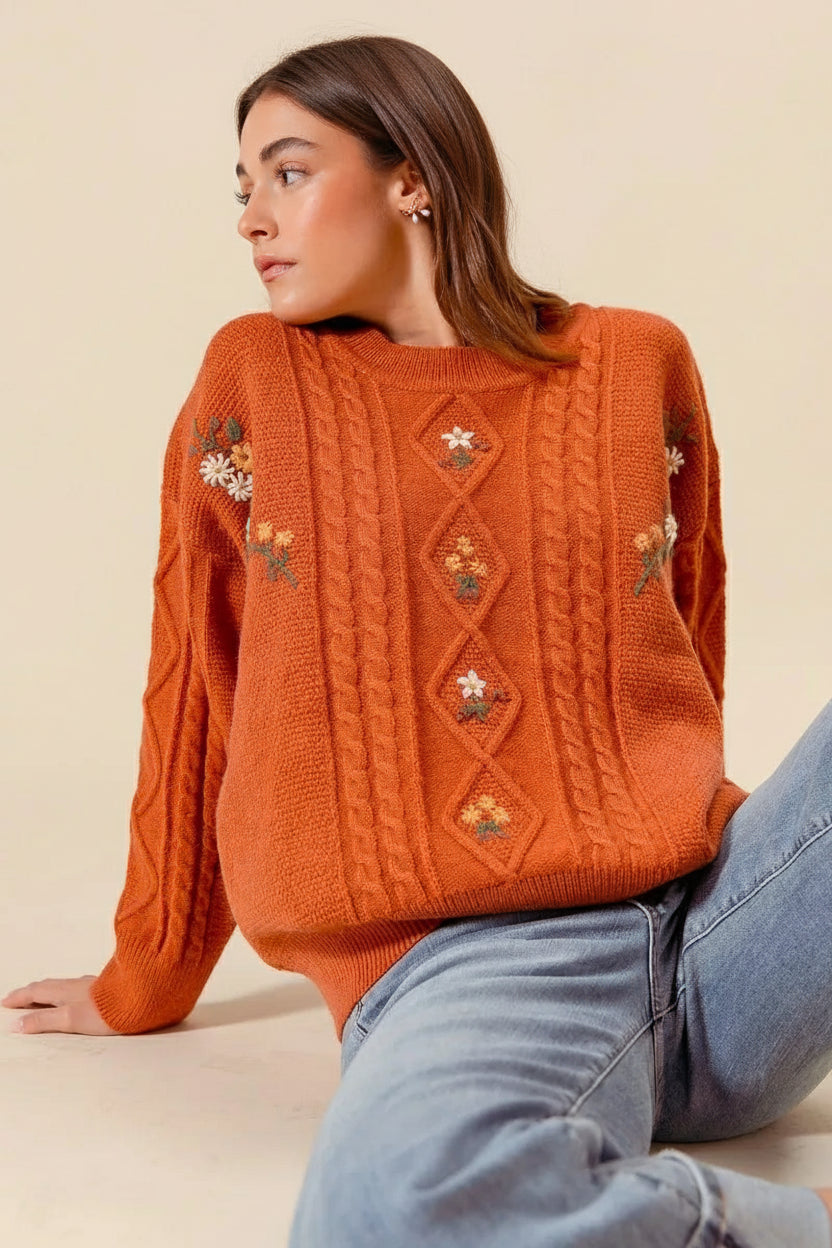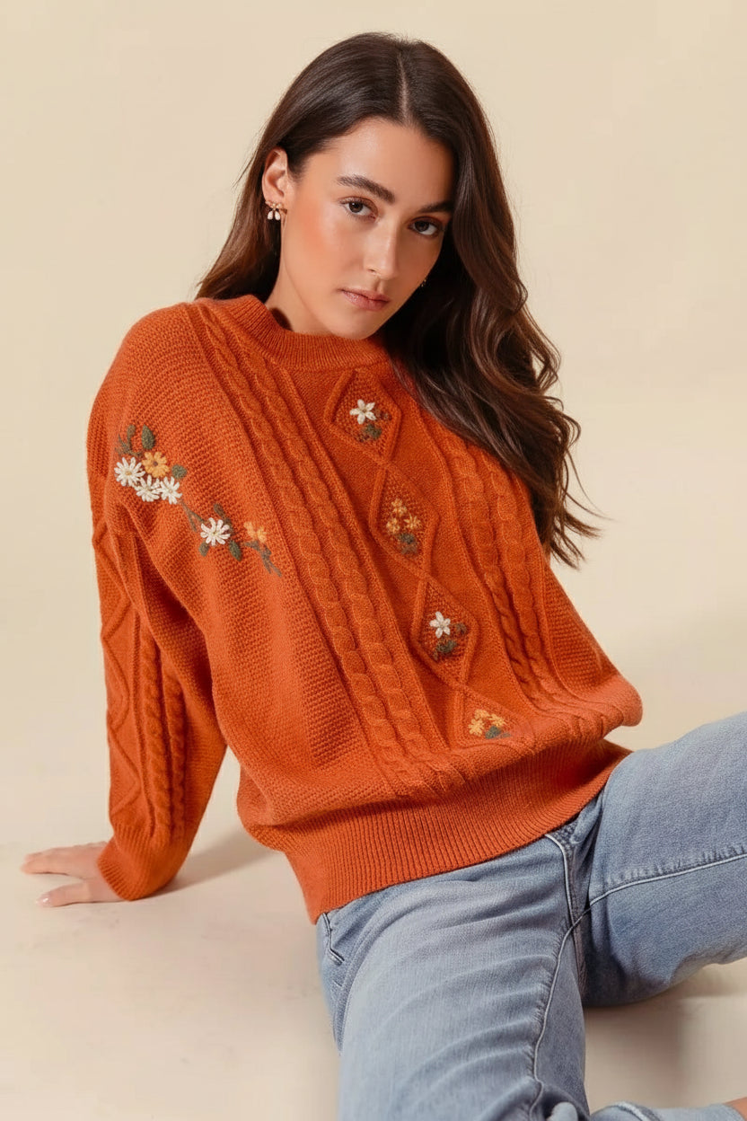 Me and You Embroidered Flower Cable Knit Sweater in Brick Orange
