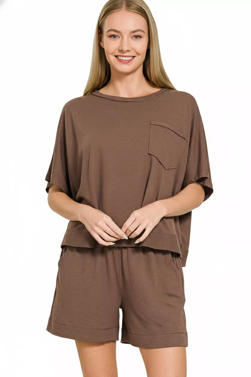 Zenana Exposed Seam Boxy Top & Shorts Set in Brown