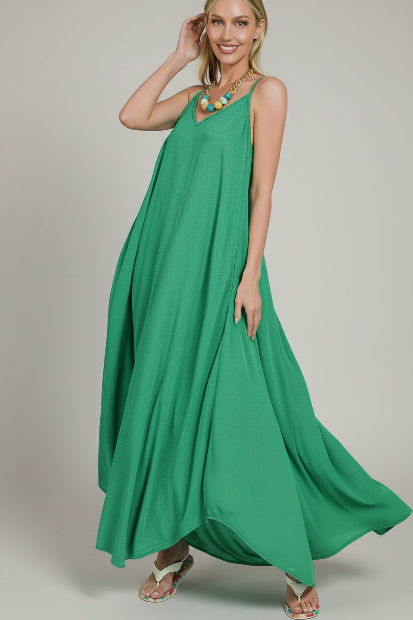 Zenana Woven Crinkle Cami Maxi Dress with Side Pockets in Kelly Green